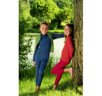 70% virgin-wool (organic)/30% silk, fine rib, colour natural, cherry-red and light ocean.