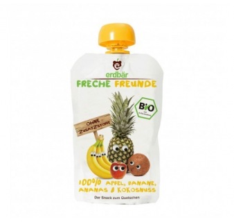 100% Apfel, Banane, Ananas & Kokosnuss. Eine Portion exotisches Obstpüree im extra großen Beutel zum Herausquetschen! Und sonst? Nichts! Und natürlich Bio, ohne Zusatzstoffe, nicht kühlpflichtig und für Kinder ab 1 Jahr geeignet!