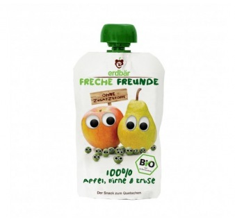 Alfred Apfel und Bettie Birne haben sich mit Egon Erbse und seiner wilden Bande angefreundet und kullern nun zusammen fröhlich in den Quetschbeutel.