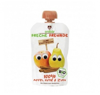 100% Apfel, Birne & Zimt. Eine Portion Obstpüree mit einer kleinen Prise Zimt im extra großen Beutel zum Herausquetschen! Und sonst? Nichts! Und natürlich Bio, ohne Zusatzstoffe, nicht kühlpflichtig und für Kinder ab 1 Jahr geeignet!