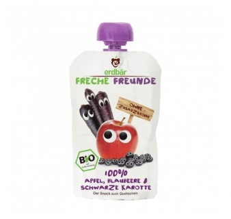 100% Apfel, Blaubeere & Schwarze Karotte. Eine Portion Obst- und Gemüsepüree im extra großen Beutel zum Herausquetschen! Und sonst? Nichts! Und natürlich Bio, ohne Zusatzstoffe, nicht kühlpflichtig und für Kinder ab 1 Jahr geeignet!