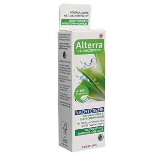 Die Alterra Nachtcreme mit Bio-Aloe Vera ist eine beruhigende und harmonisierende Pflege speziell für die besonderen Bedürfnisse der trockenen und empfindlichen Haut während der Nacht. Pflanzliches Glycerin gleicht den Feuchtigkeitshaushalt der Haut aus. Das kostbare und natürliche Gletscherwasser aus den Schweizer Alpen verleiht Ihnen ein Gefühl von Frische und Reinheit. Die reichhaltige Kombination mit Bio-Sonnenblumenöl und Bio-Sheabutter pflegt die Haut und sorgt für ein samtweiches Hautgefühl.